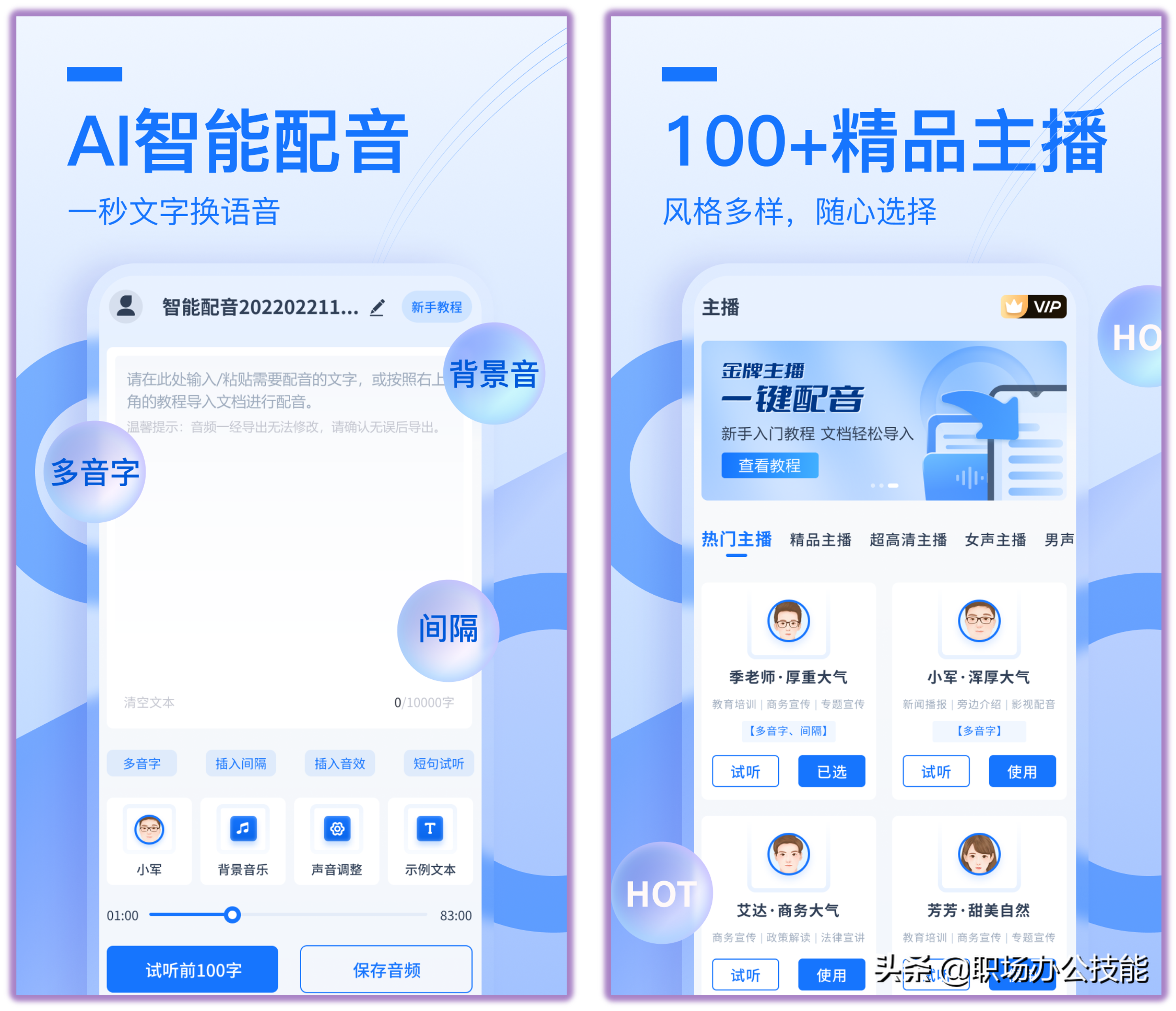 剪辑视频需要配音,自己的声音不好听,这款工具可以把文字转换成语音,内置100种不同的AI人工智能主播,自由挑选配音,还支持多人配音的模拟对话场景。并且还提供语速、语调设置,让配音效果更加完美。