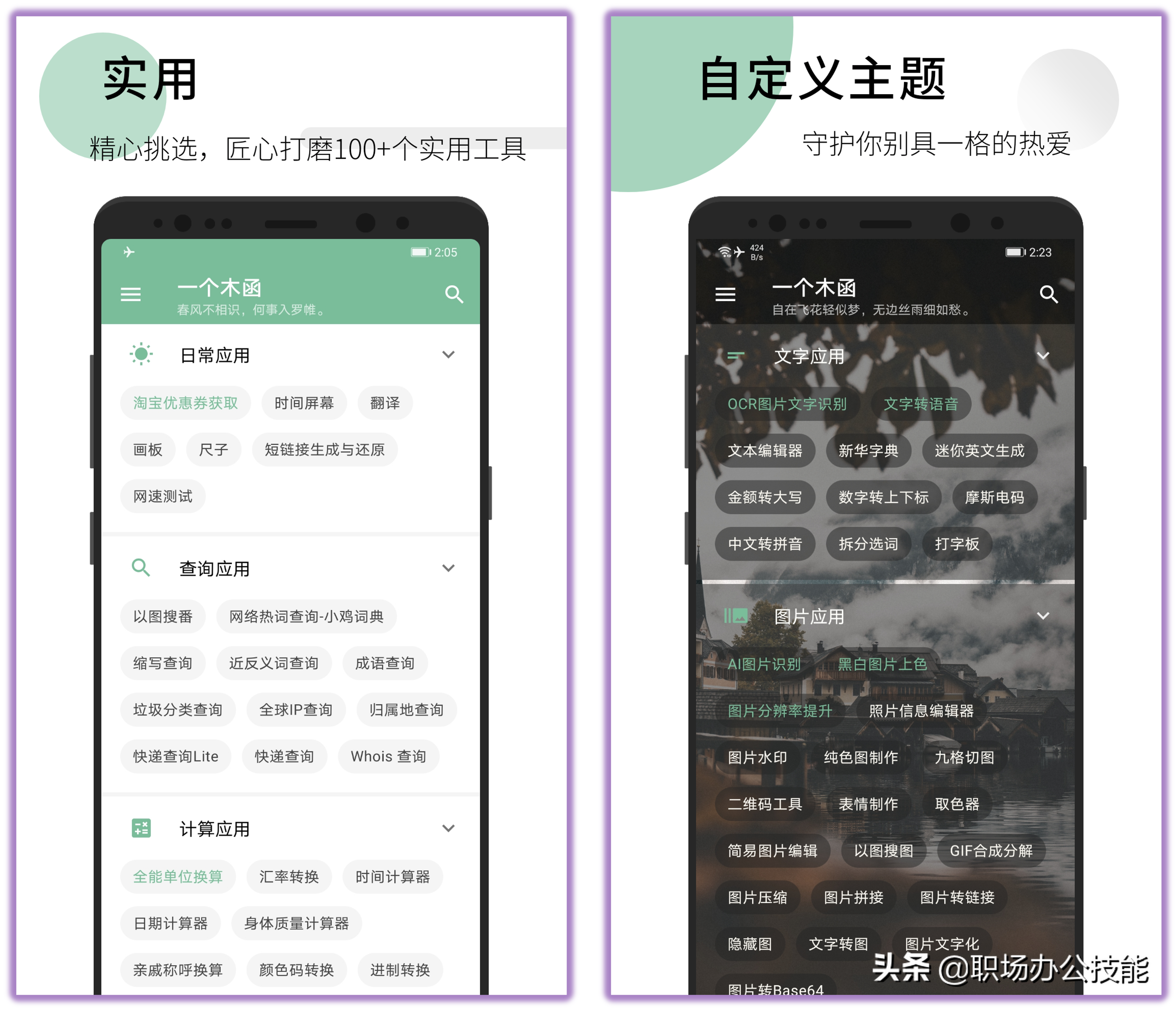 堪称手机工具箱,它把日常会遇到的一些常见应用,都集合到了一起,包含屏幕时钟、物品识别、单位换算、测量尺子、以图搜图等100多种实用功能,让你无需为了某个功能而单独下载App,建议手机里常备。