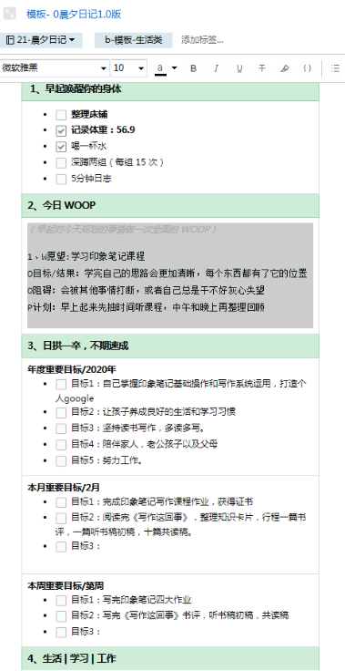 关于晨夕日记模板,这是对某一天的安排,早上计划,晚上总结。对此我先使用的是欢喜老师的模板,稍微调整了一下,还不算完全适合自己,一边使用一边更新吧。