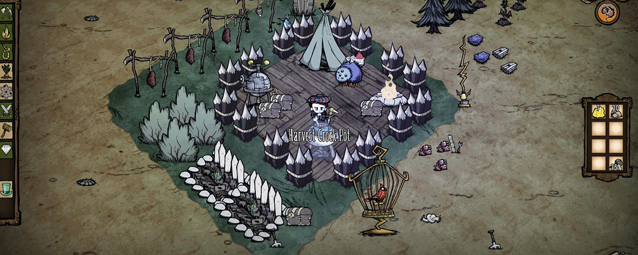 如果不开mod,农场主的终极目标就是农场全部种满火龙果。一火龙果三树枝就可以做出的火龙果派兼具75饥饿值与40血量的优异属性,实乃居家旅行必备之良品。建立农场需要大量草、石头和便便,还需要一只鸟。推荐下地洞采荧光草换便便同时多找点石头回家,路过沼泽不要忘记采八个芦苇做鸟笼。路上看到种子收集一下,刷出火龙果后就可以吃喝不愁为所欲为。