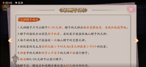另外一个就是本身的设置也是比较合理的,因为阴阳师游戏中的设定是只能进行赠送R式神或者是SR,所以一般人都是选择SR,并且还有一个限制规则就是每个玩家最多只能获得一次赠予的式神,当然自己可以进行赠予无数遍不过是有CD时间的,并且只限制了新手才行,不过以三个六星式神作为新手的界限相对来说还是比较合理的,并没有太多的不公平。