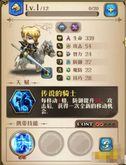 天赋:传说的骑士:每移动1格,防御提升5%,攻击后,获得一次全新的移动机会。