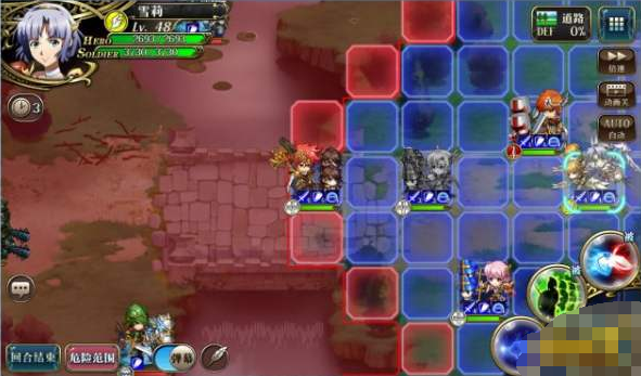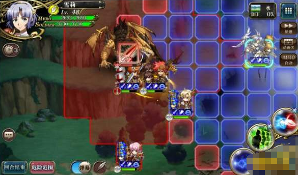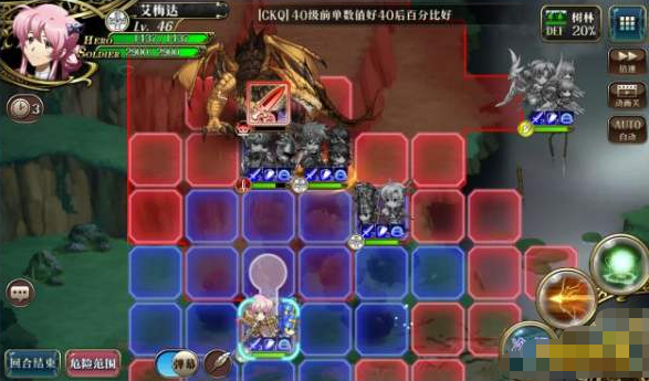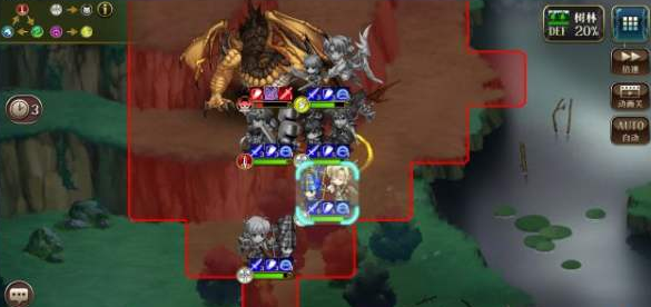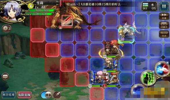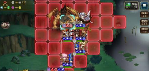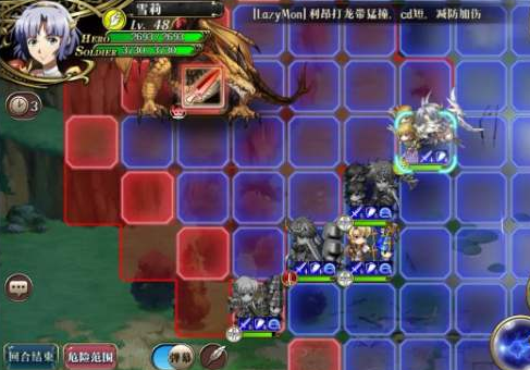 第10回合,该回合BOSS必放AOE,因为上把龙只打了雷丁一个人,行动顺序如下-雪梨出警戒圈-25文驱散-雷丁有BUFF加BUFF-利亚娜右边一格加雷丁血量-粉毛退到第4格。