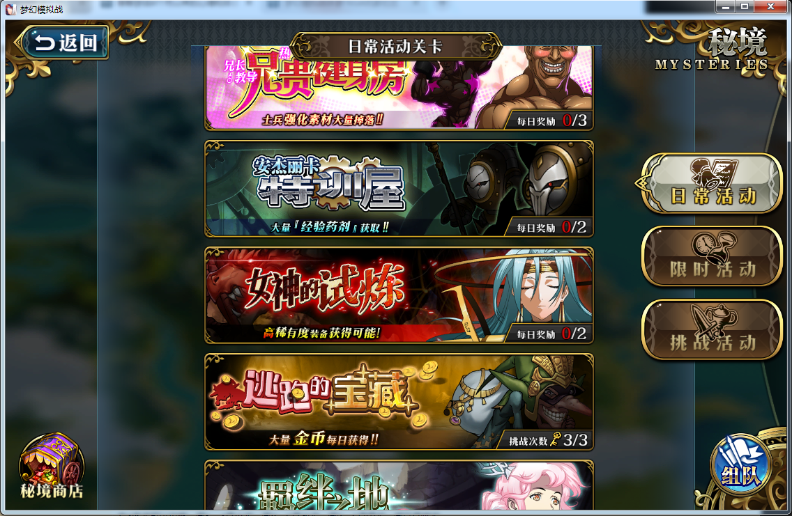 秘境是游戏里内容最多的部分,我这里只能简单提一下秘境目前有3大块:日常本,限时本,挑战本日常本又是有7个本,每天有不同的奖励次数,在奖励次数期间可以获得巨额收益,次数完了之后也可以继续刷,但是收益降低很多,其中女神本(龙本)和兄贵本可以买25月卡增加1次次数:1.兄贵本获得兵营强化材料周1,4是剑,弓兄贵,周2,5是枪,飞兄贵,周3,6是骑,僧兄贵,周日全都可以刷,每天奖励次数2次,有月卡3次兄贵本是前期被新人忽略比较严重的副本,很多人都是打完日常奖励就不打了,但是兄贵本是最值得刷的副本,因为兵营是这个游戏非常重要的一个内容,小兵强不强直接决定了你的人物强不强,很多人贪恋人物面板属性,但是不练兵营也只是银枪蜡头,看着好看一戳就破,会玩的玩家玩小号是泡在兄贵本不出来的,建议新人重视起来(当然前期只有铜书铜材料的时候别刷过头了,铜材料很容易溢出),建议20到30级开始养成刷兵营的好习惯2.职介本获得经验药水,每天奖励2次药水溢出还是挺严重的,建议每天打完2次就可以扔下了,不值得没有每日奖励情况下刷的本,值得一提的是这个本的兵种克制会放大,建议尽量选择克制人物和兵种去打3.女神本获得装备和装备强化道具(锤子),每日奖励1次,有月卡2次有4条龙可以攻略,周1,4是火龙,周2,5是冰龙,周3,6是雷龙,周日是暗龙后期大家最爱刷的本,谁不喜欢刷装备呢?但是收益也是非常低的,不过如果缺少锤子(强化装备用),这个本还是值得刷的,前期建议打完日常就算了4.哥布林本获得金币的副本,没得刷,每天任务会送1个钥匙,也是卡金币卡成狗的元凶,有时间尽量打掉,金币缺口极大,正常玩家我估计1年都填不平这个本怪物全部都是不会反抗很弱小的哥布林,建议前期练1到2个会AOE的角色来打5.羁绊本获得羁绊礼物和钥匙的,每日奖励1次这个本产出最多的羁绊礼物是这个游戏溢出最严重的材料,而钥匙前中后期又都非常缺(前期卡银,后期卡彩),但是这个本钥匙收益又被每日任务完爆,所以属于食之无味弃之可惜,建议起码把每日次数打掉,不值得刷6.超时空试炼有各种丰厚奖励的周常本,每周刷新,只能攻略1次这个游戏的难度顶点之一,SS难度极高,55级前能通SS试炼的凤毛麟角,甚至很多人60级很长时间都无法打通SS试炼,奖励极其丰富,有大量金币和钻石,通过SS也是这个游戏最难获取的SSR饰品奖励一个超时空的攻略也是这个游戏非常大的一个特色,我没有见过哪个游戏是每周放出1次完全不同的副本群供玩家挑战和攻略的,每次都能获得极大的讨论量(在神殿出来之前论坛讨论最多的副本之一),我觉得这也是梦幻模拟战手游最有魅力的副本虽然超时空在老玩家培养这么长时间后已经没有那么难了,但是对新手来说依然是极大的挑战,建议量力而行,每周论坛和贴吧都会有非常多好心人大佬提供攻略参考,可以多看看7.永恒神殿提供心之羁绊奖励的本,日常本,每天只能攻略1次一共有4个本,周1,4是瓦尔基里,周2,5是白龙,周3,6是海怪,周日是凤凰目前游戏难度的顶点,目前能通过4个65神殿我觉得是可以被称之为大佬的,这个4个本不仅难度极高,而且因为有阵营加成的存在,导致需要大量特定人物才能降低难度,像我开服玩家,因为练度比较偏的原因,只有65白龙通过比较容易,65海怪勉强能打,但是需要很多暴击的运气成分,65瓦尔基里和凤凰我目前没有任何希望新人酌情挑战即可,不能着急8.协力战必须组队的组队本,每天晚上9点开启,10点关闭,每日奖励2次,可以反复刷一共有4个本,周1,2是黑暗图,奖励附魔和武器(58级后有几率出SSR武器和附魔),周3,4是帝国图,奖励羁绊礼物和钥匙,周5,6是护送安杰里卡小姐姐,奖励附魔和防具(同样58级后有几率掉SSR),周日是守关图,3个人守3条线,奖励锤子和金币经常被人骂的一张地图,前段时间每个服务器9点开始聊天频道就开始开会了,因为协力战难度不算低,但是又强制组队,坑爹队友坑全家的情况还是比较常见的,有不少玩家都是喜欢单机玩法,这个图干脆就放弃了,个人觉得还是有点可惜。比如周1,周2的黑暗图,奖励武器非常好,而且难度偏低,练度足够的话队友挂机都能单刷,有时间还是值得打的,另外周日的守关图,虽然难度偏高,但是这个图高级奖励并不碾压低级,而且奖励金币非常赚,可以考虑选择能碾压的低级图来攻略,1人守2路就不太容易崩了当然如果实在厌恶组队,不打就是了9.限时积分活动非常良心的活动,频率目前是每月1次,每次开启2周,会赠送某个特定英雄的大量的英雄碎片(SSR为50到75个,能解锁人物,SSR为100到120个,保送4星),目前4个月赠送的4个英雄分别是:博赞鲁,弗拉基雅,杰里奥鲁,克丽丝,除了杰里奥鲁外都是实力强劲功能多样的英雄,非常值得入手(小道消息下周会开启新的积分本,赠送联动英雄科洛丝),并且有非常多丰厚的奖励,比如限定绝版皮肤,魔导石,SSR饰品和其他装备等如果你是已经有能力过至少35级的活动本的话,把日常清了之后就可以泡在积分本了,除了锤子以外都是非常值得拿的奖励另外积分本送的皮肤目前目前来看都没有再版过,属于绝版皮肤,如果有收集癖的一定别错过(多少错过芙蕾雅泳装的新人在痛哭)