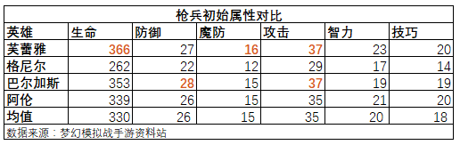 先来看下梦战所有枪兵英雄初始属性对比: