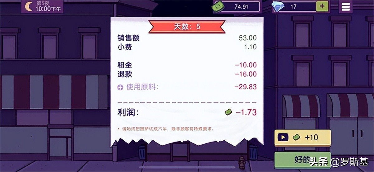 正如上图所示,每天10点后会结算游戏当日的流水和利润。你每涂一次酱料,每放一个配料,都代表着成本在上升。
