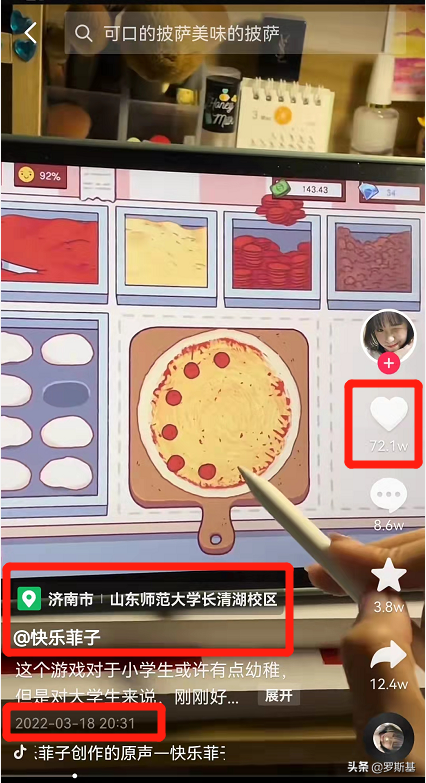 《披萨》在抖音上第一款爆款的视频是玩家于3月18号晚的自来水投稿,目前点赞71万。播放量数据,大家可以根据100个观看1个点赞来进行估算猜测。