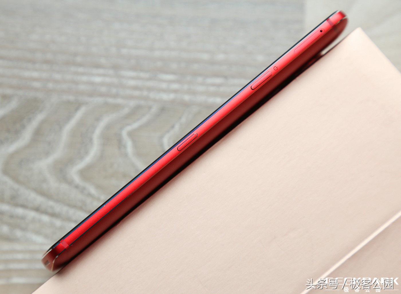 我们手上这台 T8s 是大红色的版本,中框两侧各切了一圈倒角,金属倒角上没有再上色,红色磨砂中框和银色亮面倒角拼在一起。