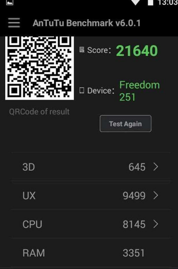 实际的性能表现也是让人打呼过瘾,Freedom 251在安兔兔测试中总成绩居然高达21640分,相当于三年前国产千元机的水平,应付低负载应用应该没太大问题,而且价格仅为24元,连一顿饭的价钱都不到,配置却能做到如此良心,不得不说Freedom 251打得一手好牌。