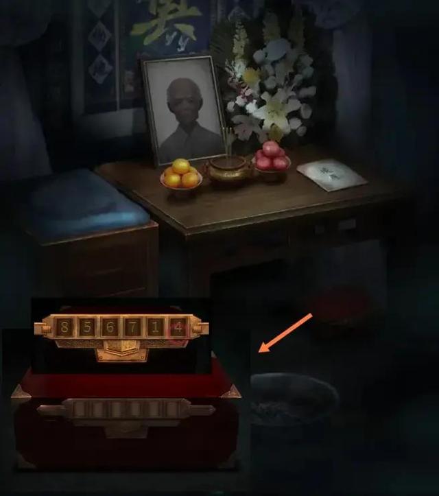 点击小区左侧老人灵堂,在灵堂中点击桌子下方的密码箱,输入密码856714。