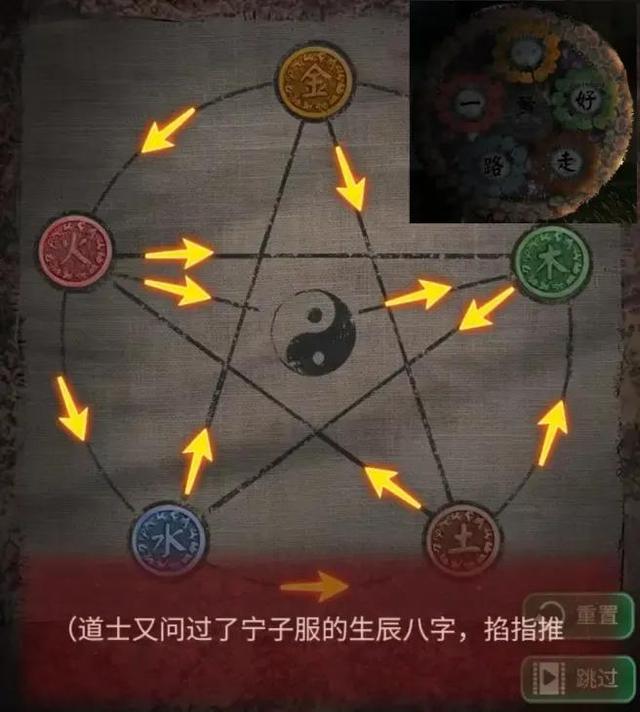 将咒符给道士后,他会让你拼一个八卦盘,这里金木水火土与小区外的花圈颜色相对应,按照花圈颜色将金木水火土摆放到正确的位置即可。