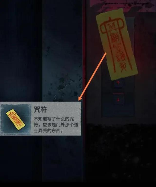 进入居民楼后,会发现右侧绿色箭头走不通,无法上下楼,点击左侧电梯,会获得一个咒符,拿着咒符去找小区门口的道士。