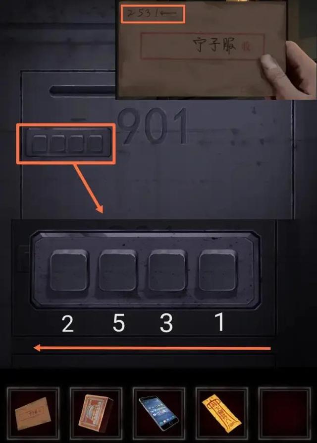 在一楼点击邮箱柜,点击901号箱子左侧按键,根据信封左上角的数字以及箭头可知,四个方块从右至左依次按对应数字次数。