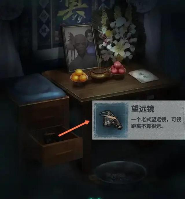 点燃后左侧第二个抽屉开启,获得望远镜。