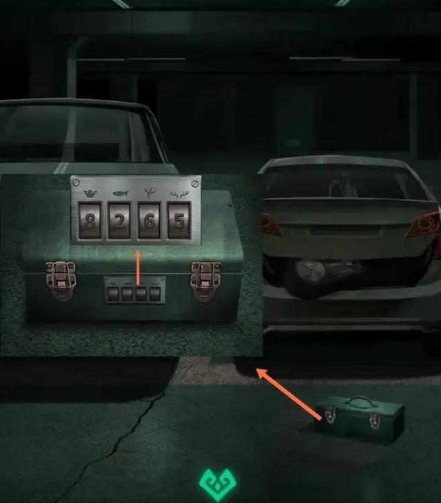 进入居民楼,搭乘电梯到B1层,点击右下角绿色密码箱,根据元宝、鱼、凤爪、鹿角的图标可知,与之前在各楼层看到的年画有关,根据楼层数,可知密码为8265。