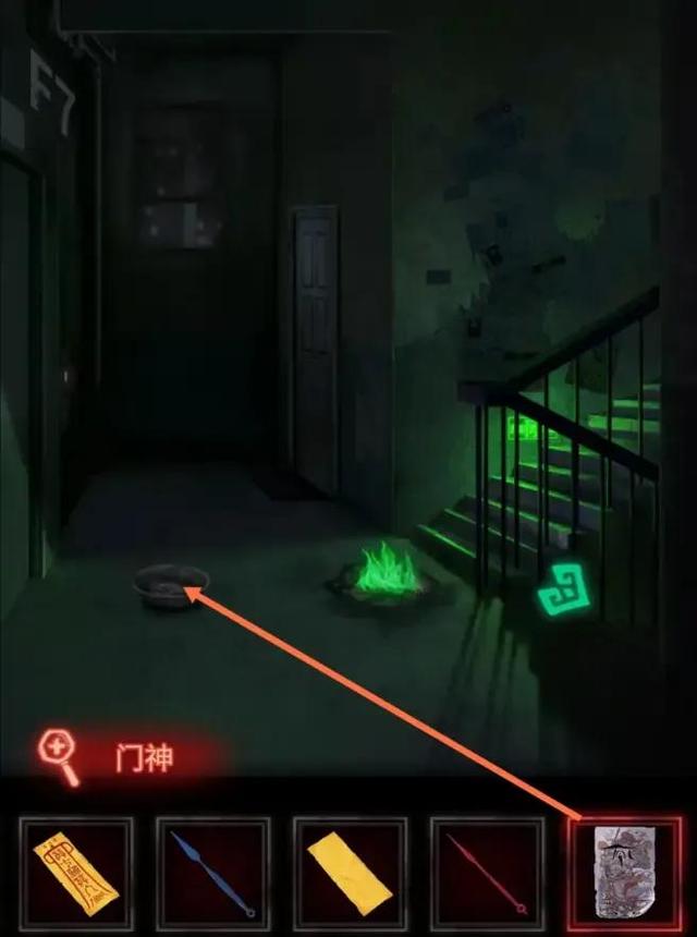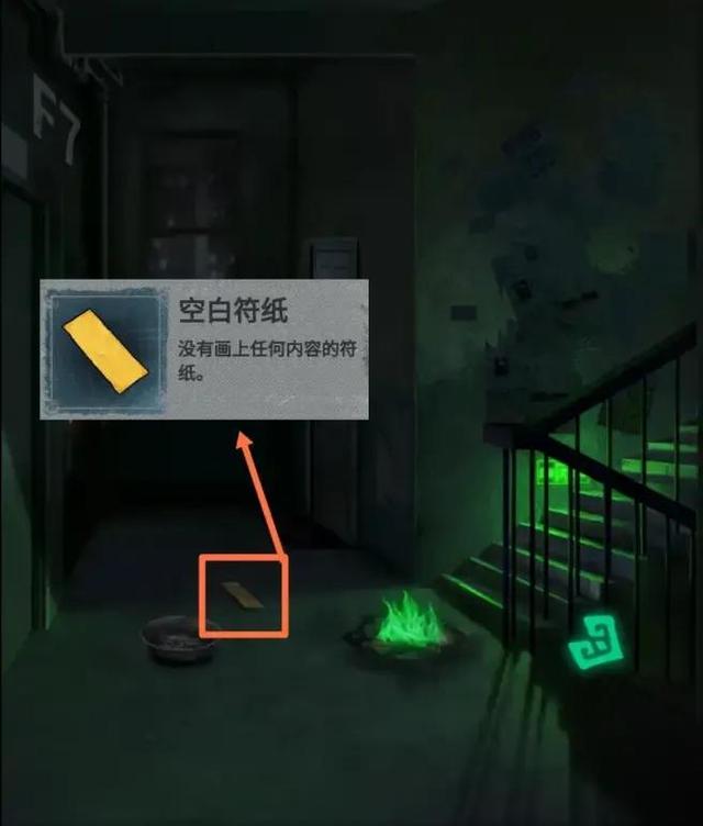 七楼发现没有老人,是地上燃起的绿火的原因,首先点击地上的黄色纸张,获得空白符纸。