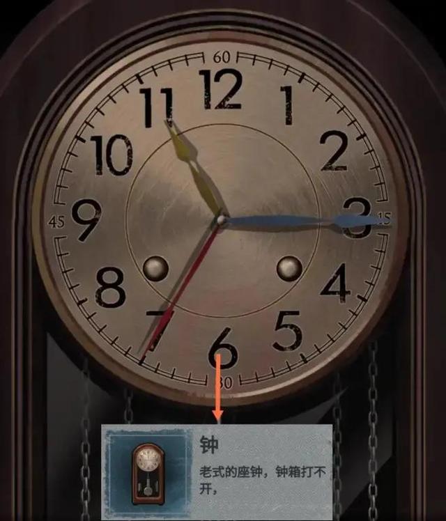 到B1层,点击右侧车辆后备厢的钟,将蓝色指针、黄色指针、红色指针放入表盘,并按照上图所指方向摆放摆好后可获得钟。