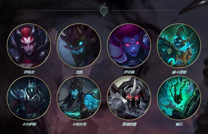 排除目前已有的英雄,他们分别是扭曲树精·茂凯、复仇之矛·卡莉斯塔、掘墓者·约里克、蜘蛛女皇·伊莉丝、战争之影 赫卡里姆。另外还有图片中没有的暗影岛英雄: