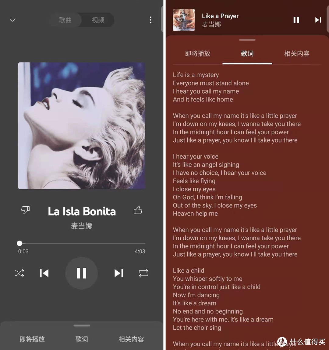 大部分歌曲都有歌词,点击播放界面的绿色Full Lyrics按钮(下图左)即可显示歌词(下图右)。