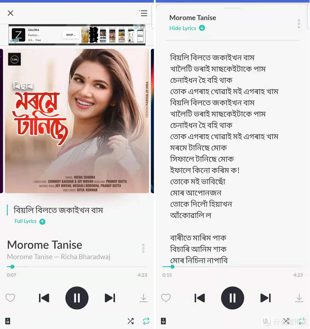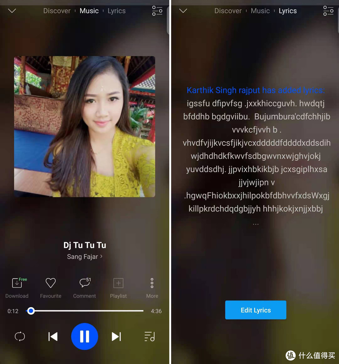 大部分歌曲都带有歌词,点击播放界面上方的Lyrics按钮(下图左)即可显示歌曲的歌词(下图右,我的手机没有安装东南亚字体,看起来应该是乱码了)。