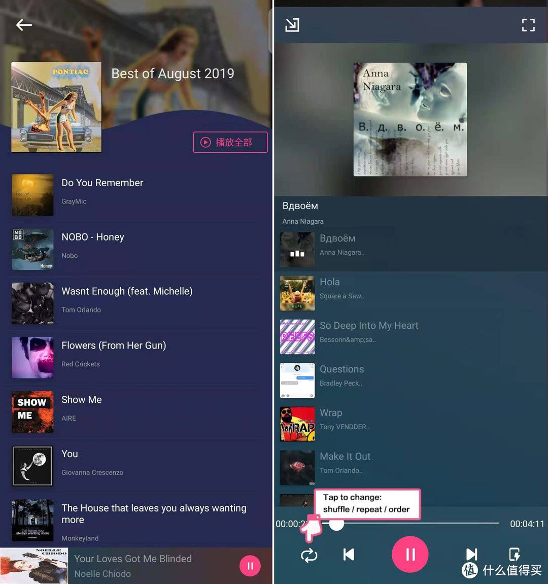 每个歌单都有很多不错的歌曲(下图左),歌曲播放界面见下图右。