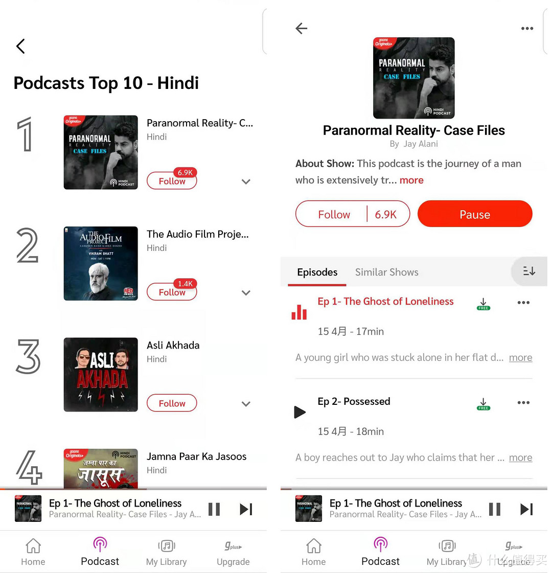 Gaana还有一个收听Podcast的功能(下图左),而且可以通过点击“Free的向下箭头”来免费下载Podcast节目(下图右)。