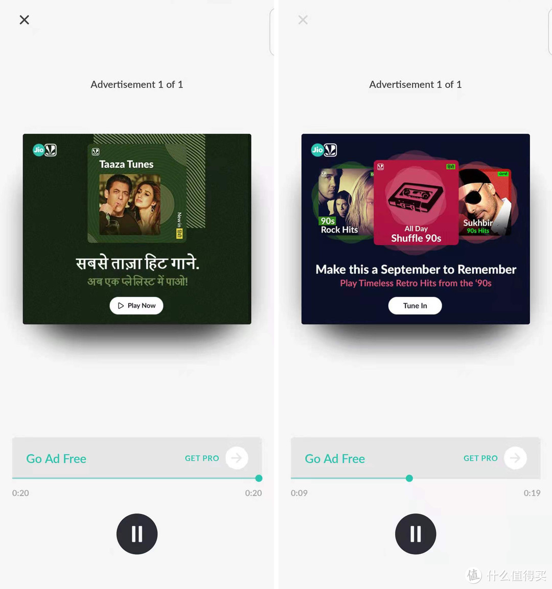 JioSaavn的一个特点就是免费会员的广告特别频繁,几乎每播完一首歌都有语音广告(广告弹出的效果见下图)。