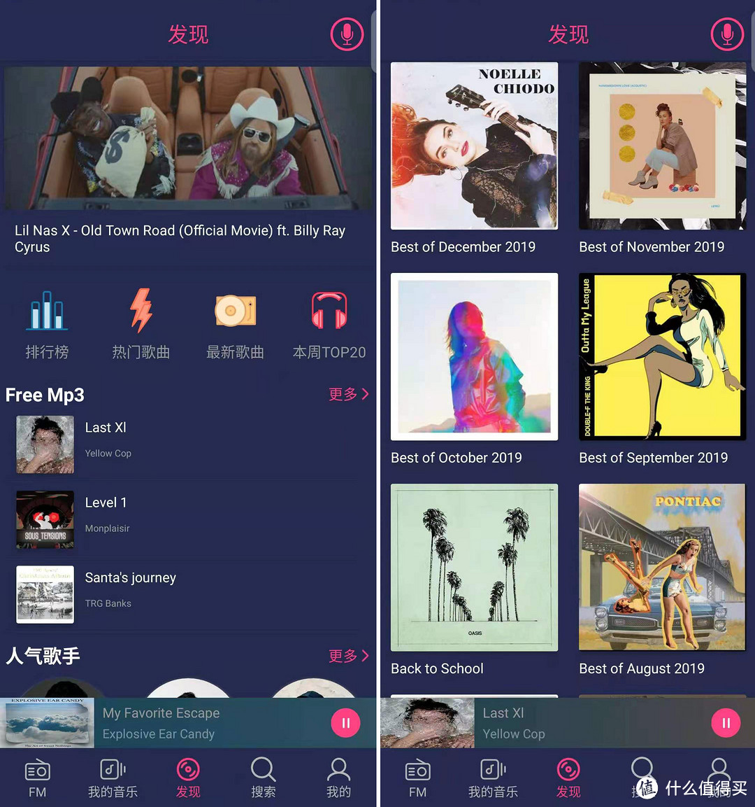 Free Music的精髓在于歌单,无数特别好听的歌单!在app“发现”界面往下滑(下图左),可以发现无数特别好听的歌单,例如2019年12月最佳歌曲清单,2019年11月最佳歌曲清单等等(下图右)。