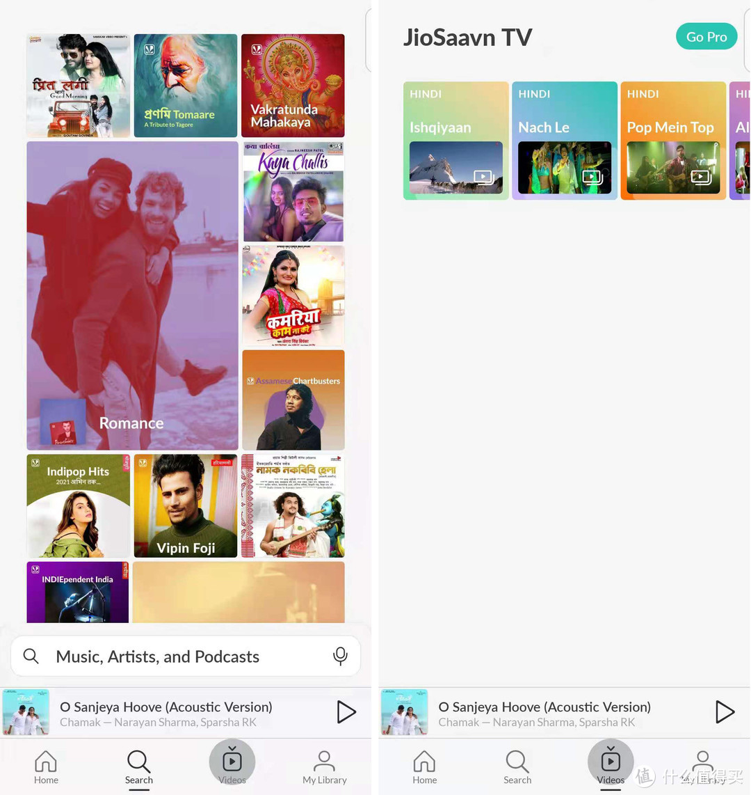 JioSaavn的软件界面颜色很鲜艳,下图左显示“Search”(查找)界面,下图右显示“Videos”(视频)界面。在“Videos”(视频)界面可以看视频,也就是播放音乐MTV。