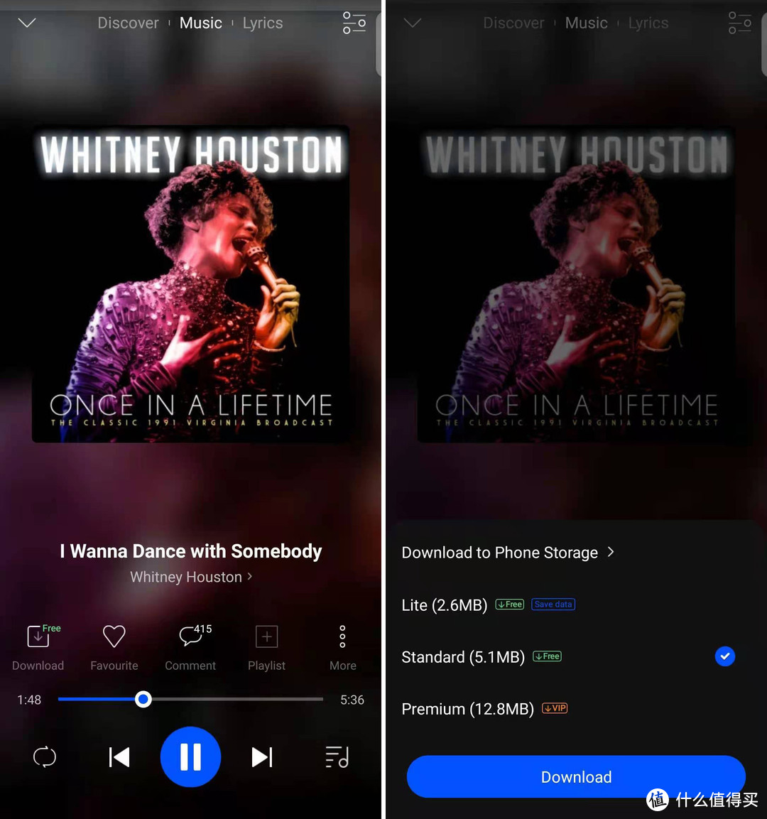 Boomplay普通会员可以下载歌曲的Standard(标准)格式,VIP收费会员可以下载歌曲的Premium(高解析)格式。遇到想要下载的歌曲,点击Free Download按钮即可(下图左),这时候会弹出下图右的对话框,在这个对话框可以选择下载普通格式、标准格式或高解析格式。