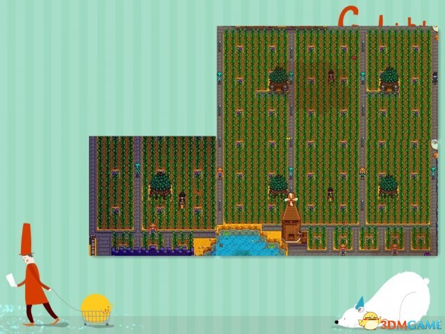 另外说一点,这是36*53的格局。布置时候需要先定好位置。54个高级洒水器,最少需要13个稻草人,因为下面4格图里的稻草人是管不到的,这是6个精灵小屋的范围。除去下面4格以上空地(种植地)一共1255,所以种子数,化肥数也就是最少125个了。