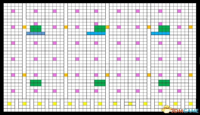 黑色与蓝色是地板(合并的单元格也是地板),紫色是高级洒水器,绿色为精灵小屋。黄色是稻草人,下面的明黄色是中级洒水器。