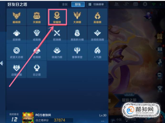 03点击切换之后,我们可以发现有许多种排行榜,比如巅峰榜,天梯排行榜,荣耀榜,大神排行榜等。我们点击荣耀榜。