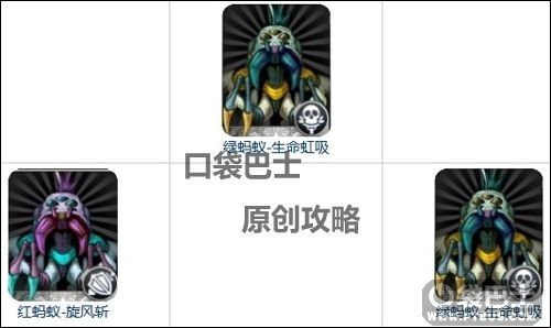 在黑石蚁穴关卡上,boss战的配置为前排左侧一个红蚂蚁,拥有战士旋风斩技能,而右侧则是一个绿蚂蚁,技能为术士的生命虹吸技能,能够对单体敌人造成大量法伤。所以如果你的输出不足的话,最好采用双T的组合,红蚂蚁对位副T,而大绿蚂蚁则对位主T,同样还是要先将后排的小怪秒掉。而在副T的选择上推荐小德或是大小姐都可以。