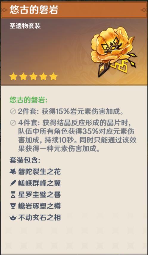 这套2+2的组合就是磐岩不是很好刷,不过因为是散套,相较于4件套来说成型要简单许多。只要有2件较好的圣遗物就可以与产出较多的角斗进行搭配了,成型较简单。