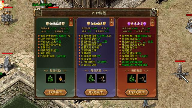 可通过充值或者打宝回收元宝积攒到1988元宝,购买至尊VIP,每日可免费领取一个价值300元宝的霸王随从(并开通VIP挂机和BOSS之家特权)