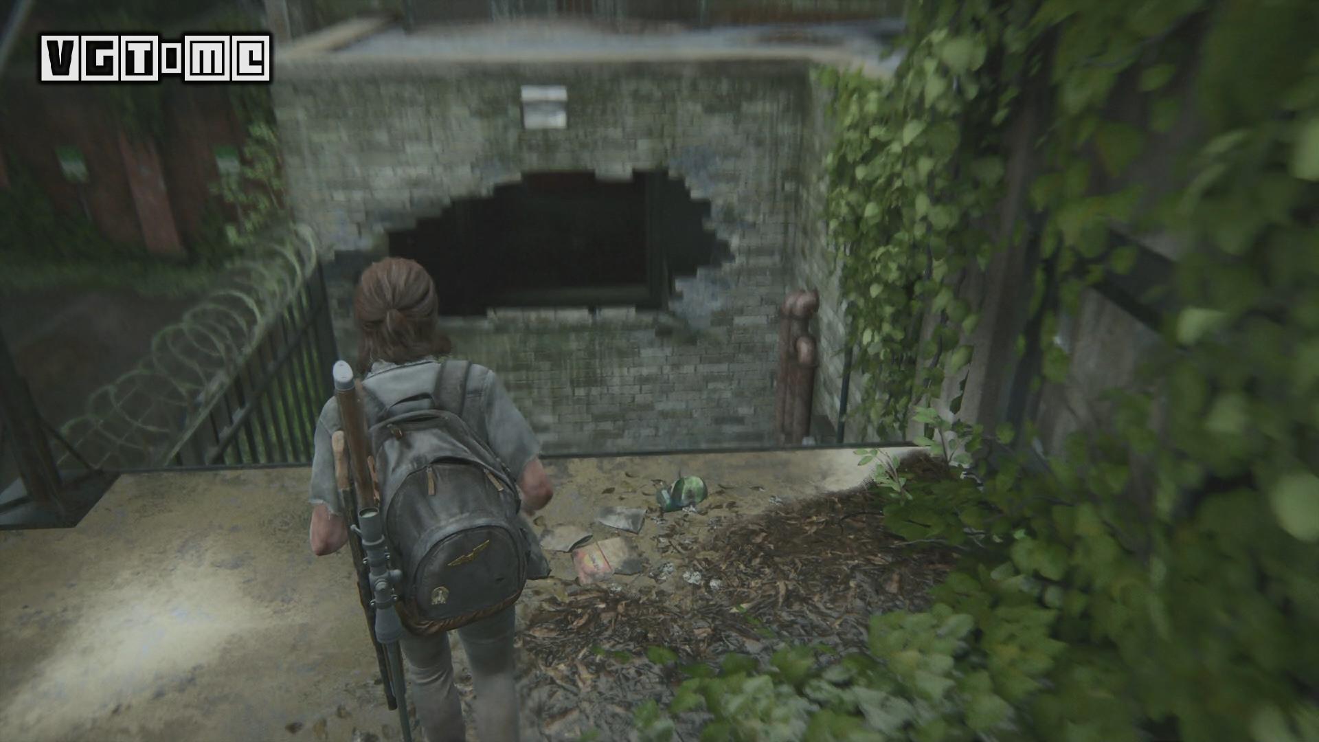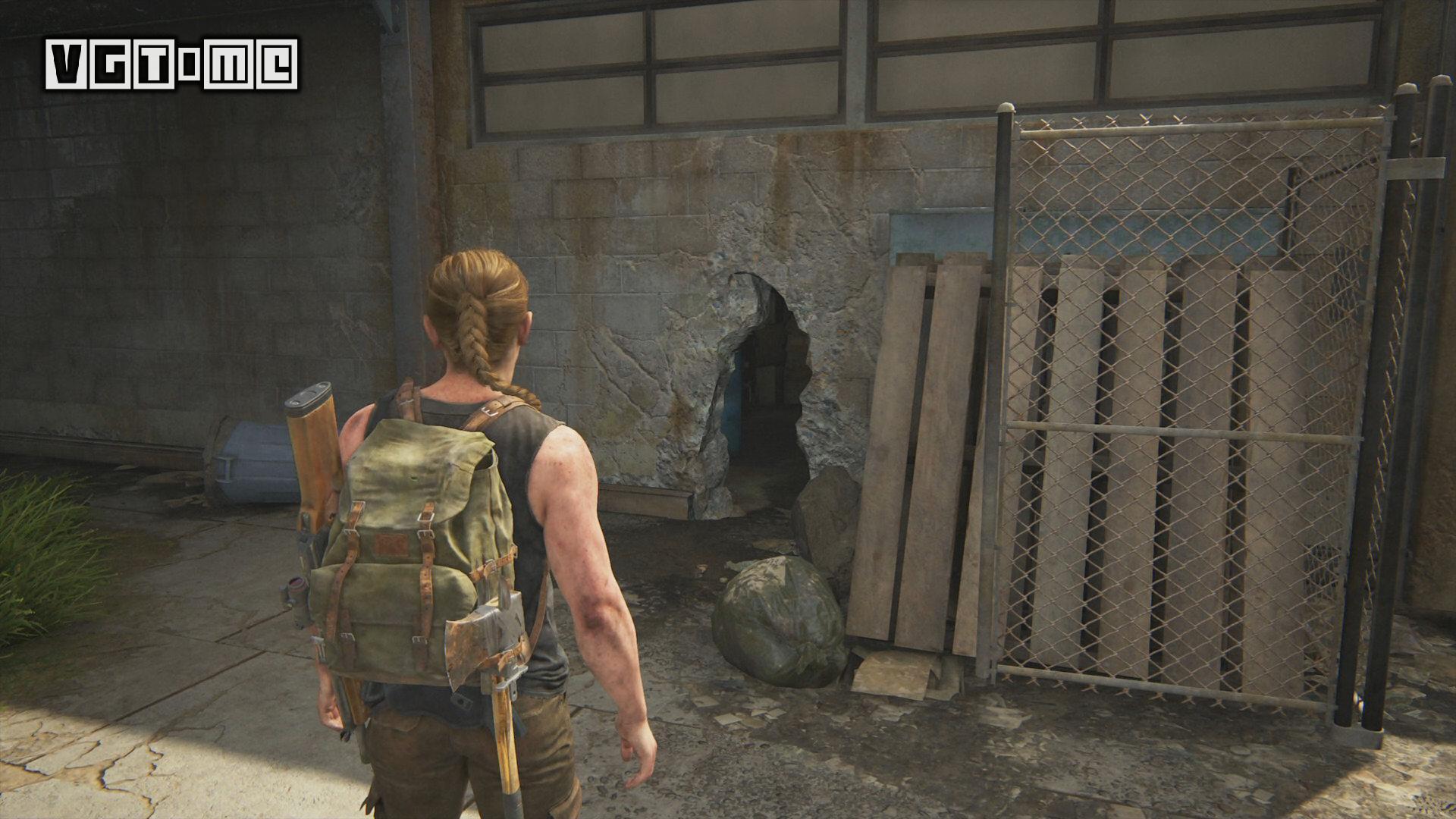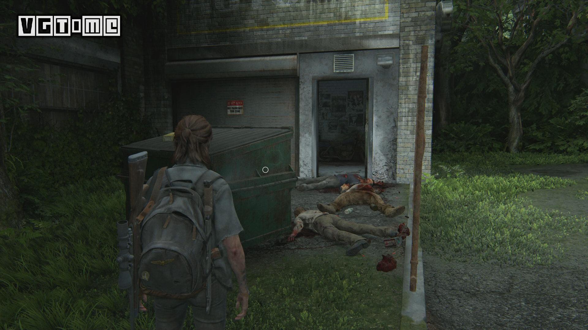 杀死第一批有狗的 WLF,继续推进流程,拉动垃圾箱爬上去跳到下图的洞里进入自行车店。