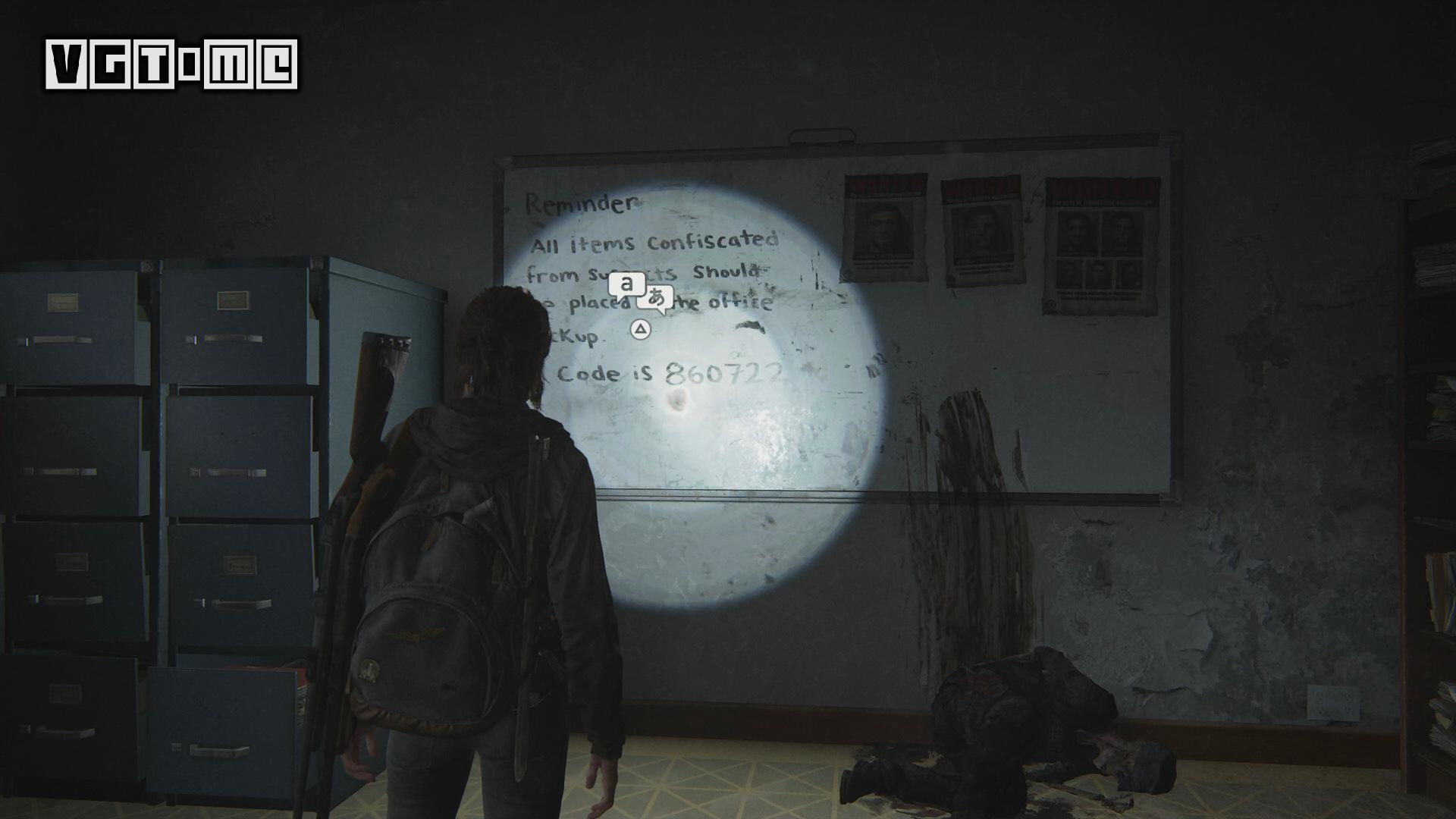 进入法庭,从楼梯来到下层,这里需要从电梯的绳子滑下去,先不继续前进,往左转敲碎玻璃进入房间,白板上写着密码「860722」,可以打开房间里的保险柜。