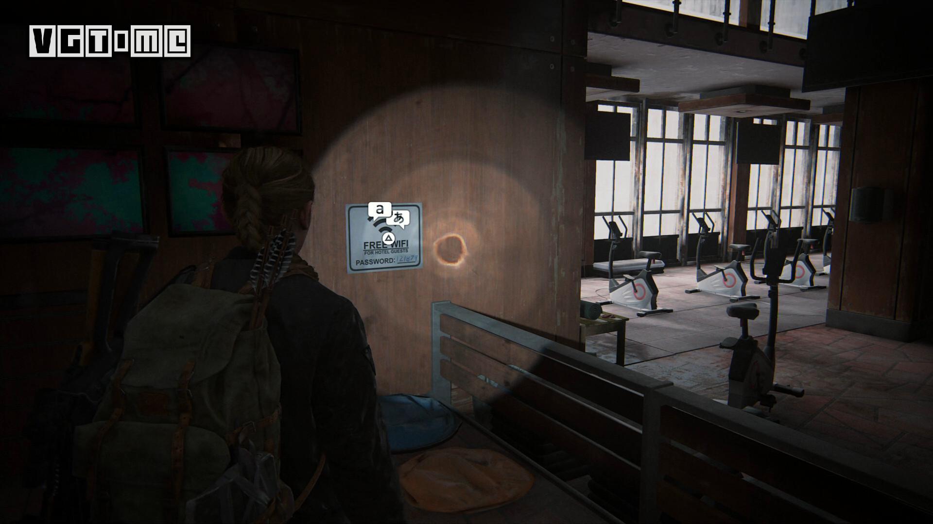 收集品显示保险箱密码是健身房的 WIFI 密码,所以去健身房看墙上的 WIFI 密码是「121879」,来到写着 21 层的楼梯间(这里是出口,先不要开门)左边的房间,里面有保险箱。