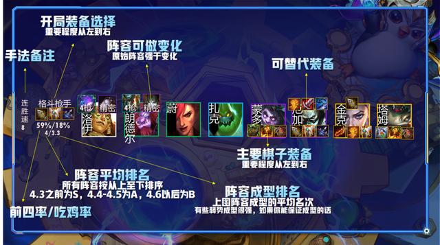 榜单从上到下为大数据胜率排序,兔子根据实战测试又自己评估了一个强度,建议大家优先玩A以上的阵容,因为榜单仅仅是8人口榜单,而比如赌狗阵容可能7人口结束,有的九五8人口难成型,所以大数据榜单并不是完全准确的,更多是我们测试阵容的一种参考方向,测试完之后的实战评估更为准确,但是评估只能针对某一个段位,同行的多少,节奏的变化都会影响阵容的强度,所以不同段位、环境看的东西又不一样。