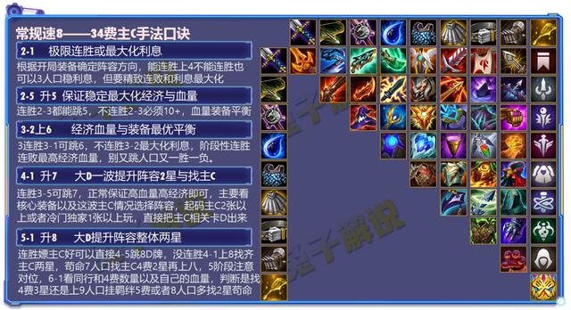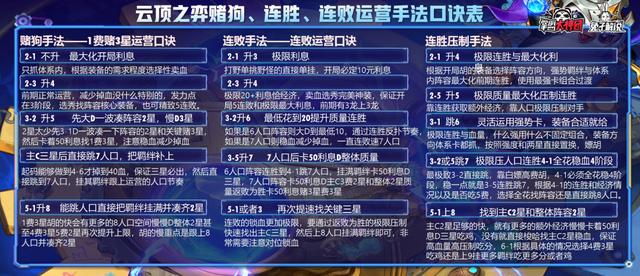 4费卡主C:虽然前期全程不亏人口,但是没法D牌所以节奏很慢,除非4费1星特别强势或者成型即无敌通常都不是毒瘤,但是4费2星综合成型的强度很稳定,吃分能力都很强,运营难度高,上限高,因为4费2星难找,通常都需要前期连胜手法好,后期会转换才能打的更好,也是虐菜的一把好手,如果4费很毒瘤,则有连败直接7人口梭哈找1星的玩法,根据2星的毒瘤程度也有4-1梭哈赌命2星的玩法,稳定的基本上都是先利用23费稳血再8人口找4费2星的玩法。