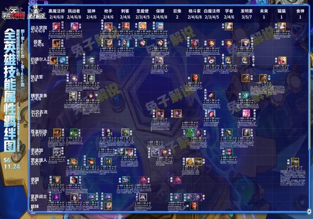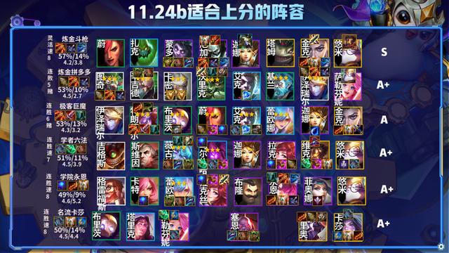比如兔子11.24b教大家玩的阵容顺序,我通常第一天先教榜首,也就是版本最强,比如11.24教的是变异巨像,但是11.24巨像是毒瘤,但是斗枪不算是,因为巨像是3费卡主C,而斗枪是45费,这个难度就完全不一样,节奏更慢的S级阵容只是你擅长的时候成型稳定上分,但是绝不会像低费S级那样对版本拥有绝对的统治力,但是我们再去看11.23,那个可以说是S6的毒瘤之最,因为是2费的刺客以及4费1星的永恩就极其强势,4费1星的难度和3费2星是一致的,而且4费2星比3费3星容易。