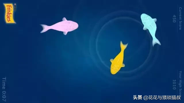 分三关,第一关一条鱼,第二关两条鱼,第三关三条鱼,就是这种色彩很鲜艳的鱼游来游去的,动态还比较自然。点中鱼就会消失,然后还有泡泡和涟漪,看着挺像那么回事的。