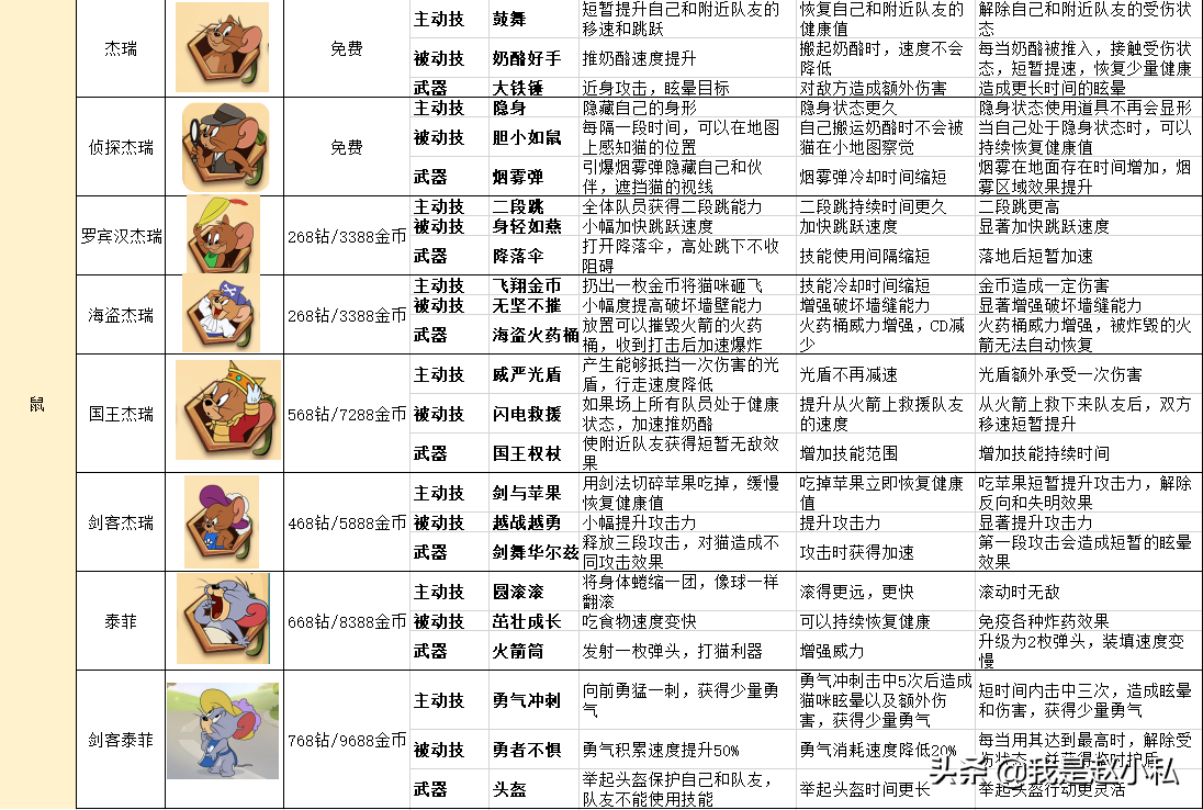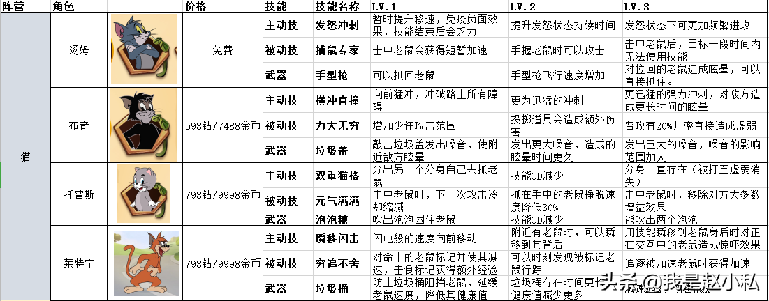 目前游戏版本共有4只猫,8只老鼠,笔者花了一段时间将各品种的猫鼠技能总结到一张表格里,至于各个角色的优缺点,不同玩家的态度还是不一样的,相对来说笔者认为鼠阵营更有优势。