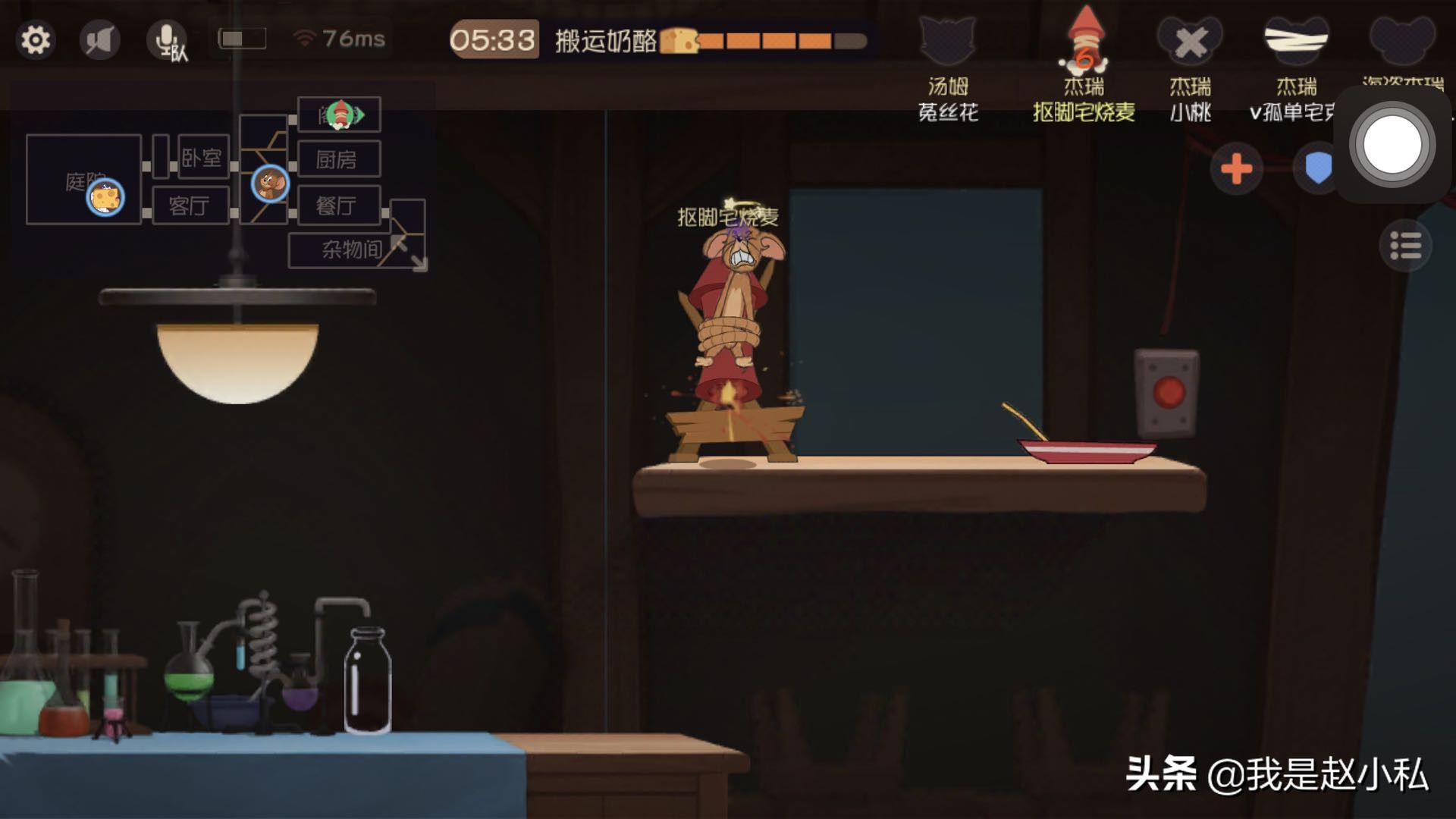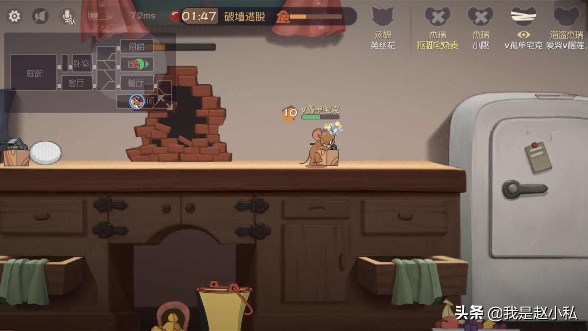 在实战操作上,以文字描述能带给各位的并不如视频更加形象生动,总的来说,作为鼠方,也有一些可以延缓猫移动的基础技能,还有能带给队友的增益技能,在角色选择上还是尽可能照顾到团队功能性,相比来说罗宾汉杰瑞更加灵活,适合担任溜猫大任;国王杰瑞则是辅助效果非常好,在吸引火力上表现出色。不过在脱离团队配合时,巧妙运用场景道具就显得尤为重要。