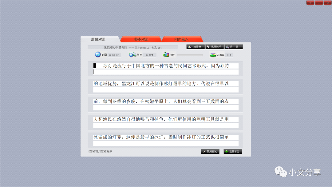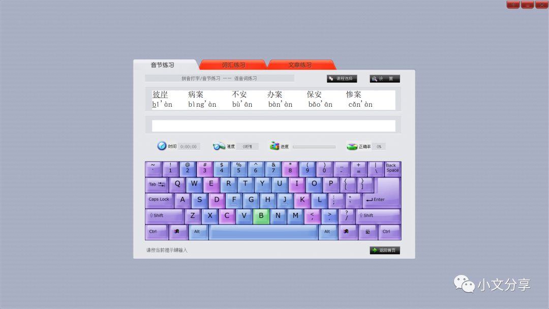1) 实时显示打字时间、速度、进度、正确率