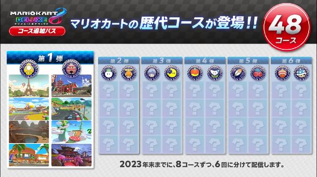 第一弹新增8个赛道包括手游《马里奥赛车巡回赛》的三条赛道以及来自《马里奥赛车64》的“可可山”、《马里奥赛车Wii》的“椰树商城”、《马里奥赛车DS》的“蘑菇岭”、GBA版《马里奥赛车:超级赛道》中的“空中花园”,以及3DS游戏《马里奥赛车7》中的“蟾蜍赛道”。此外还有两个赛事:“金色冲刺杯”和“幸运猫杯”。