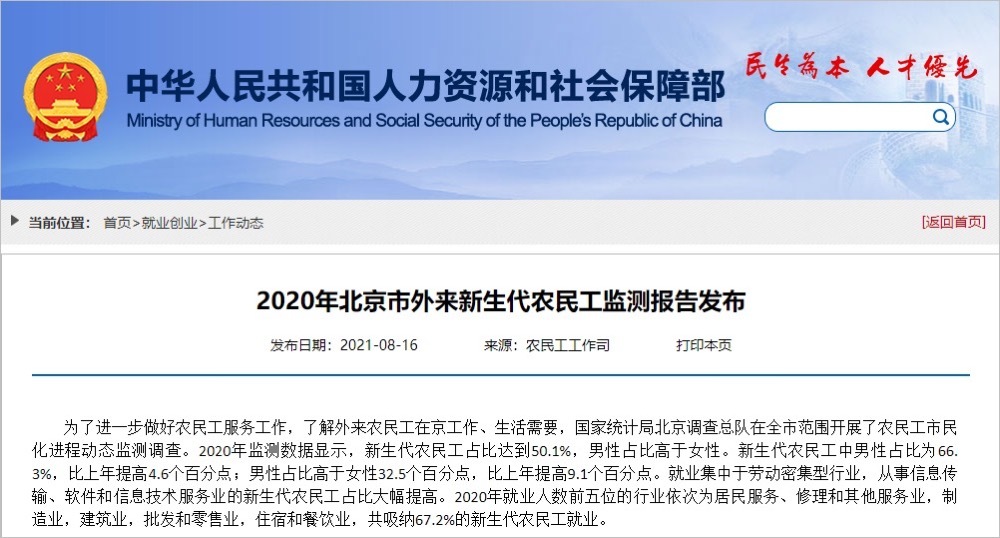 图片来源:《2020年北京市外来新生代农民工监测报告》