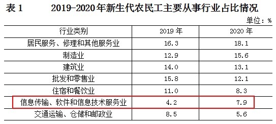 在这个行业中,“90后”农民工表现更加突出,其从业人数占比,比整体新生代农民工群体高出3.7个百分点,显示进一步向“信息传输、软件和信息技术服务业”聚集趋势。