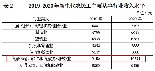 报告里说,2020年“从事信息传输、软件和信息技术服务业的新生代农民工占比大幅提高”,而且这部分从业者的“月均收入为10571元”。